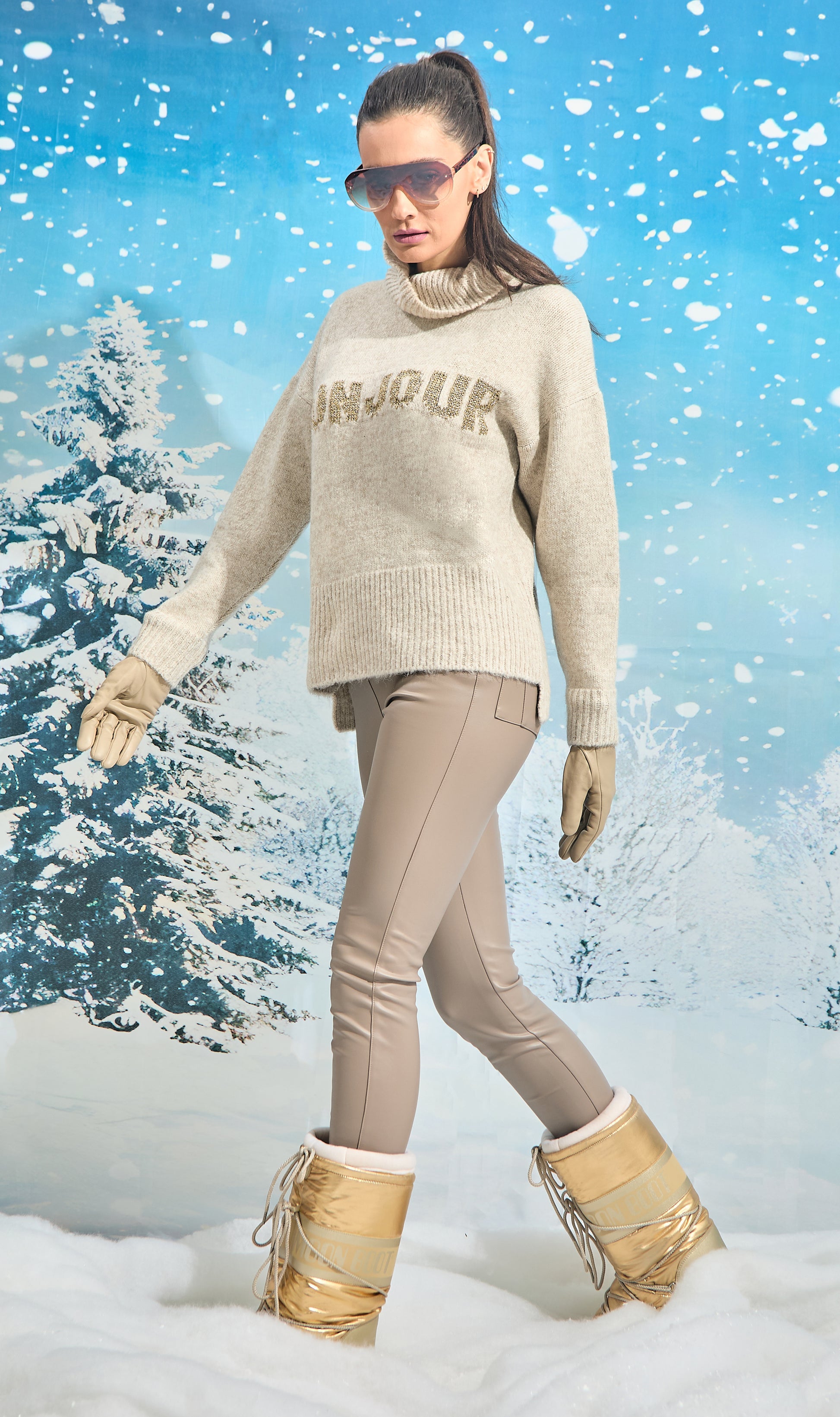 Calça térmica power stretch, malha neoprene com acabamento em couro, modelagem justa, frente lisa e bolsos costas, zípers de metal dourado com muito estastano, (couro ecológico).