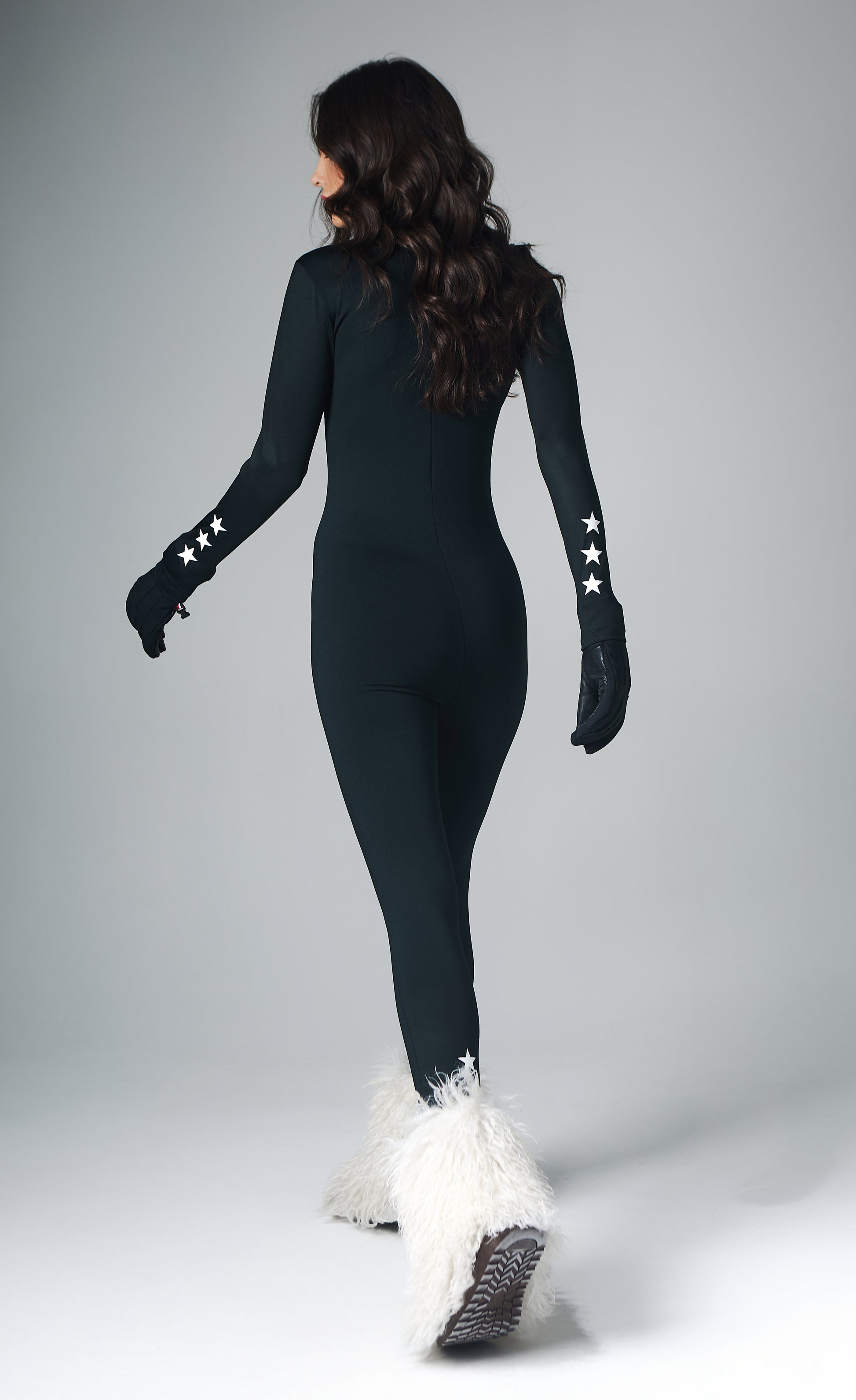 Macacão térmico ziper preto frente, estrelas brancas nas mangas e nas pernas costas, com fleece interno, com elastano, primeira camada para ski.