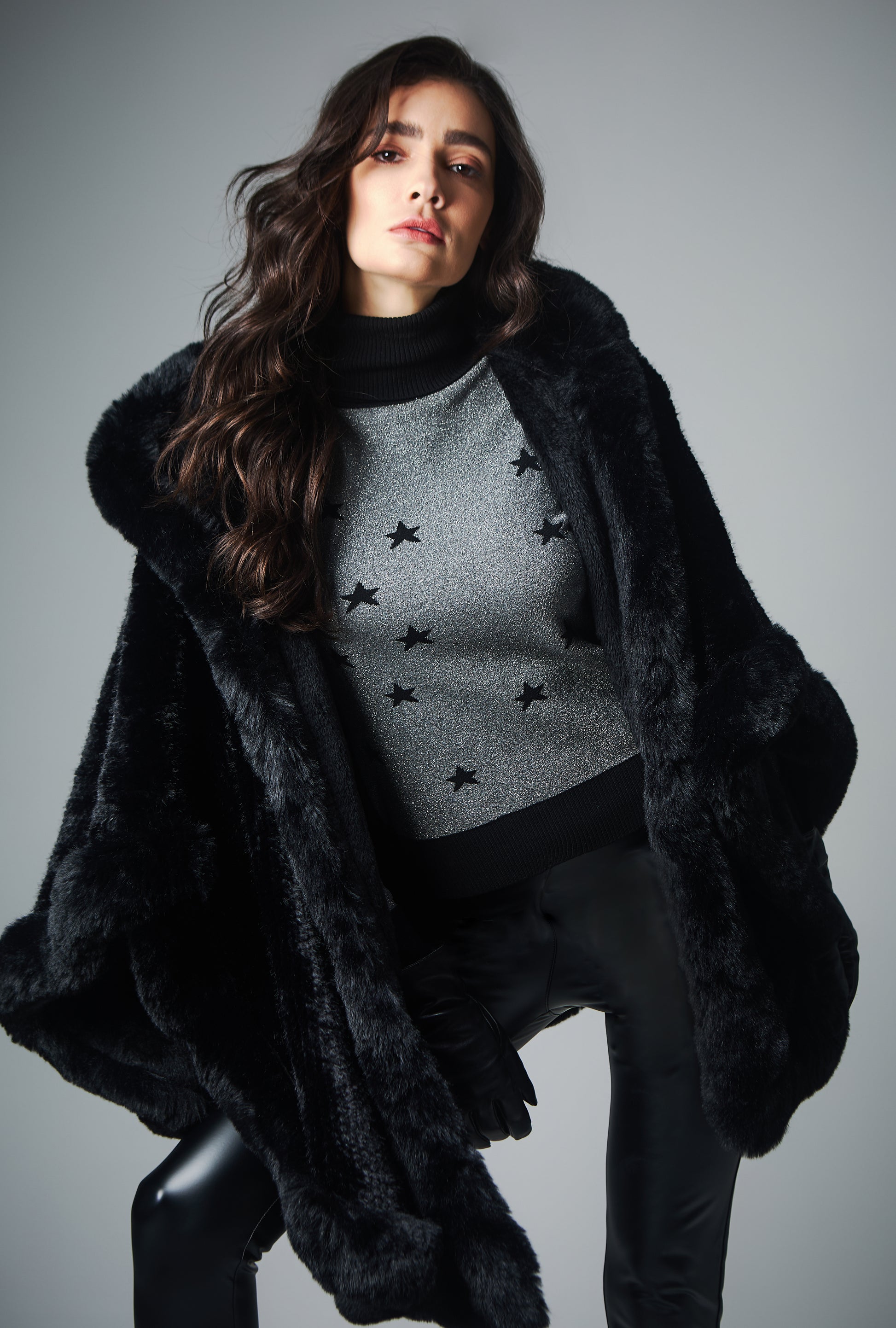 Poncho em pele fake duplo, imitação vision, com capuz, com fechamento pescoço