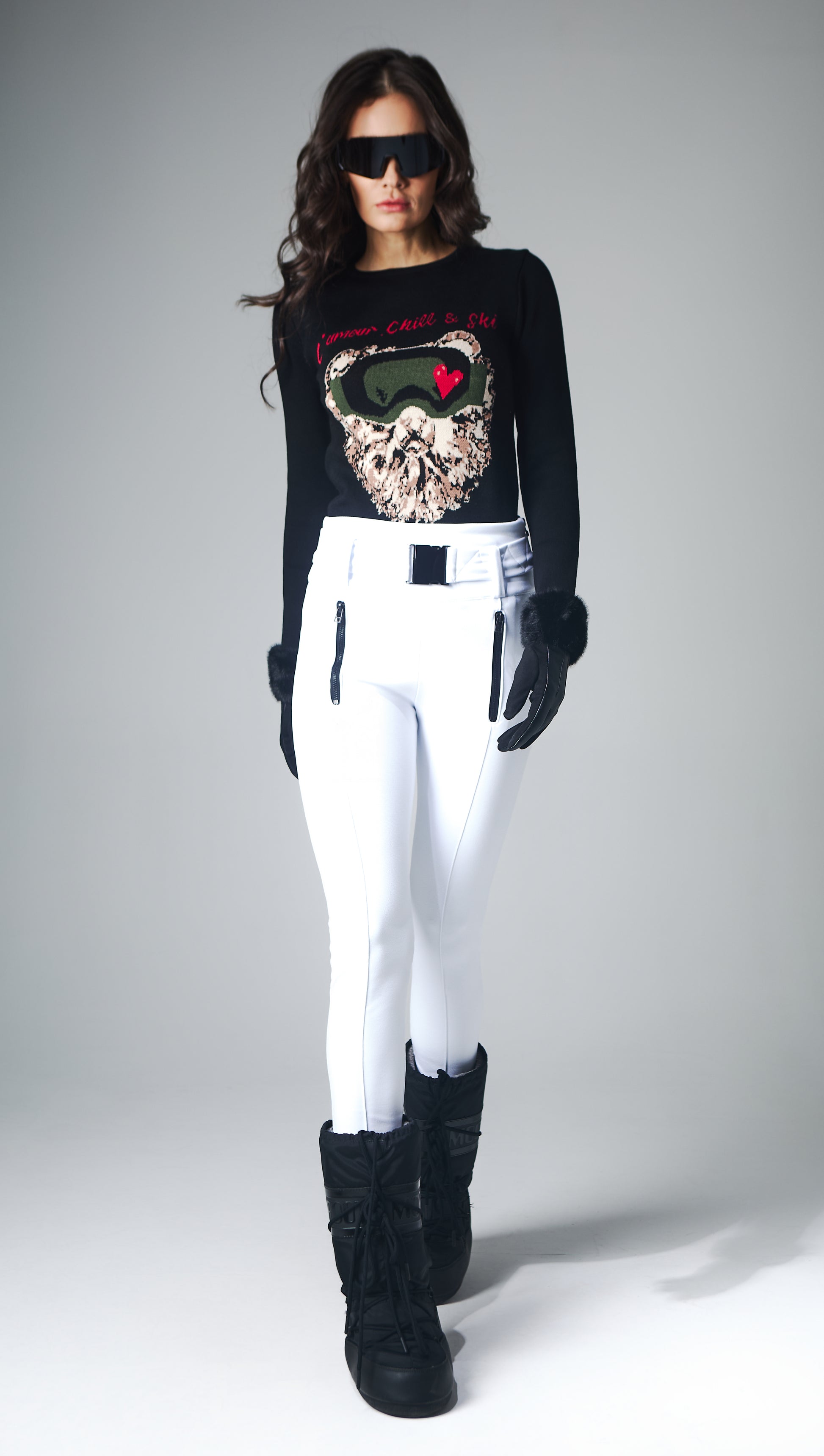 Tricot urso em jacquard, malha grossa, modelagem seca próxima ao corpo com elastano.