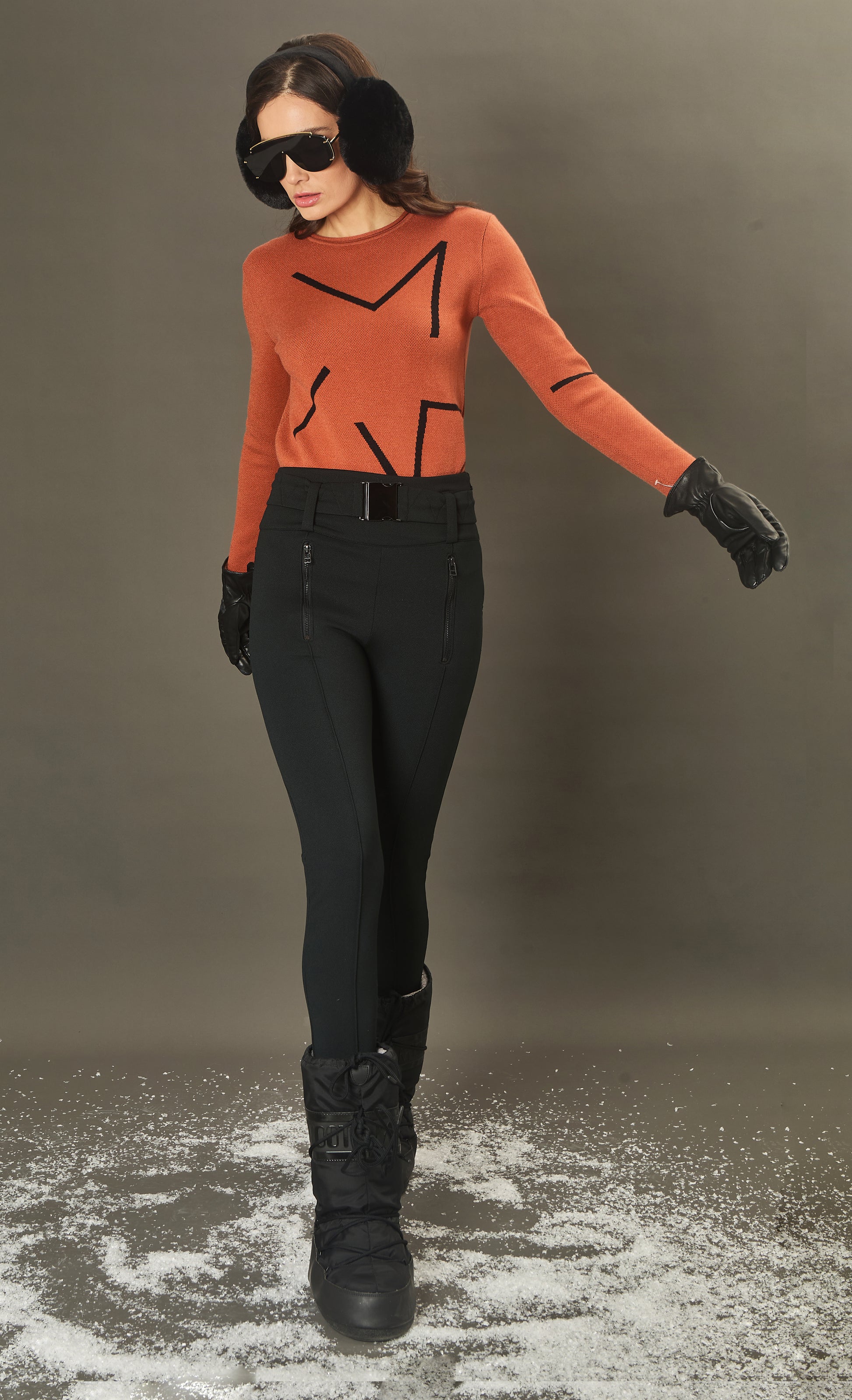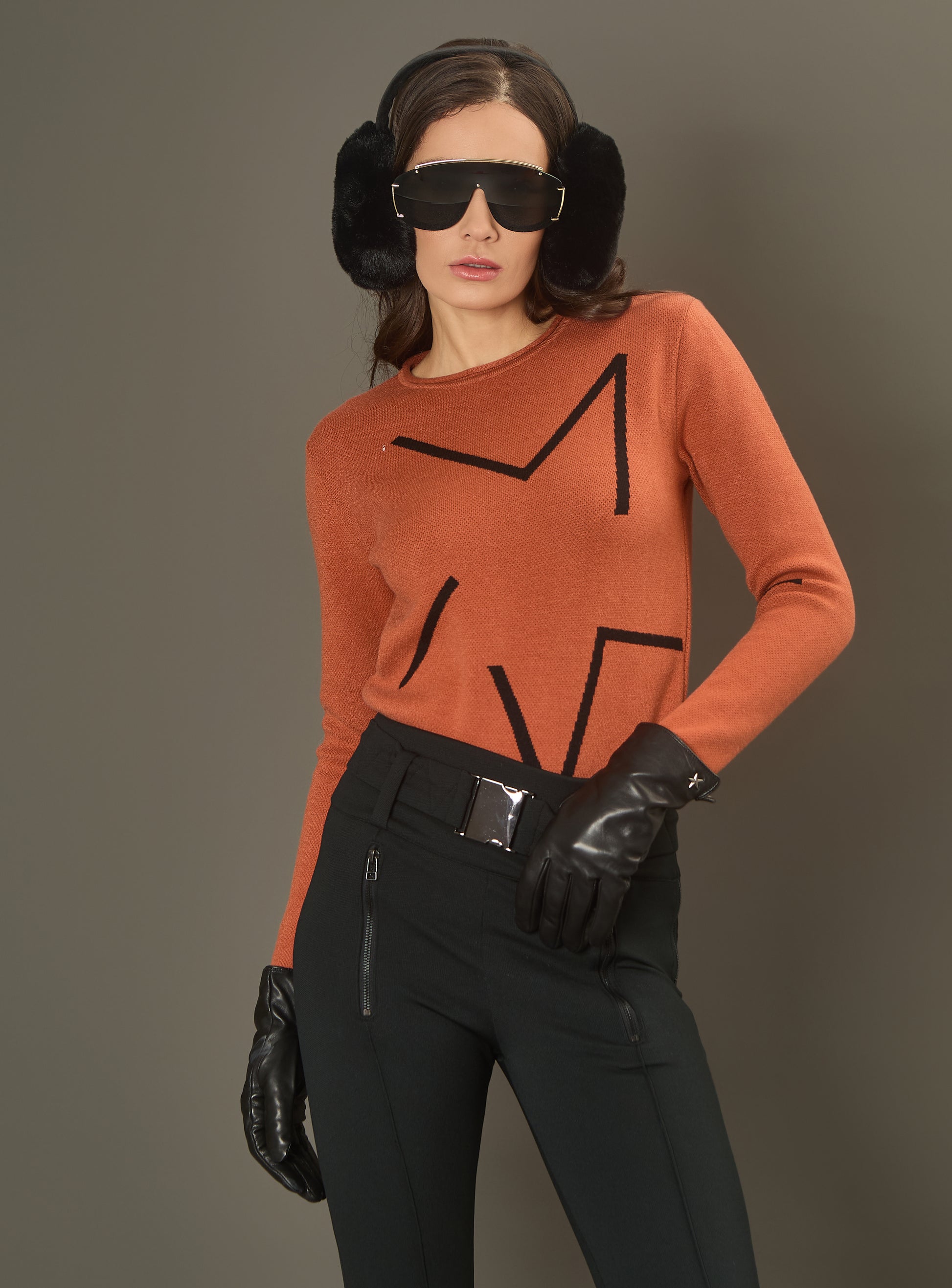 Malha em tricot grossa, estrela em jacquard, modelagem mais seca, com elastano.