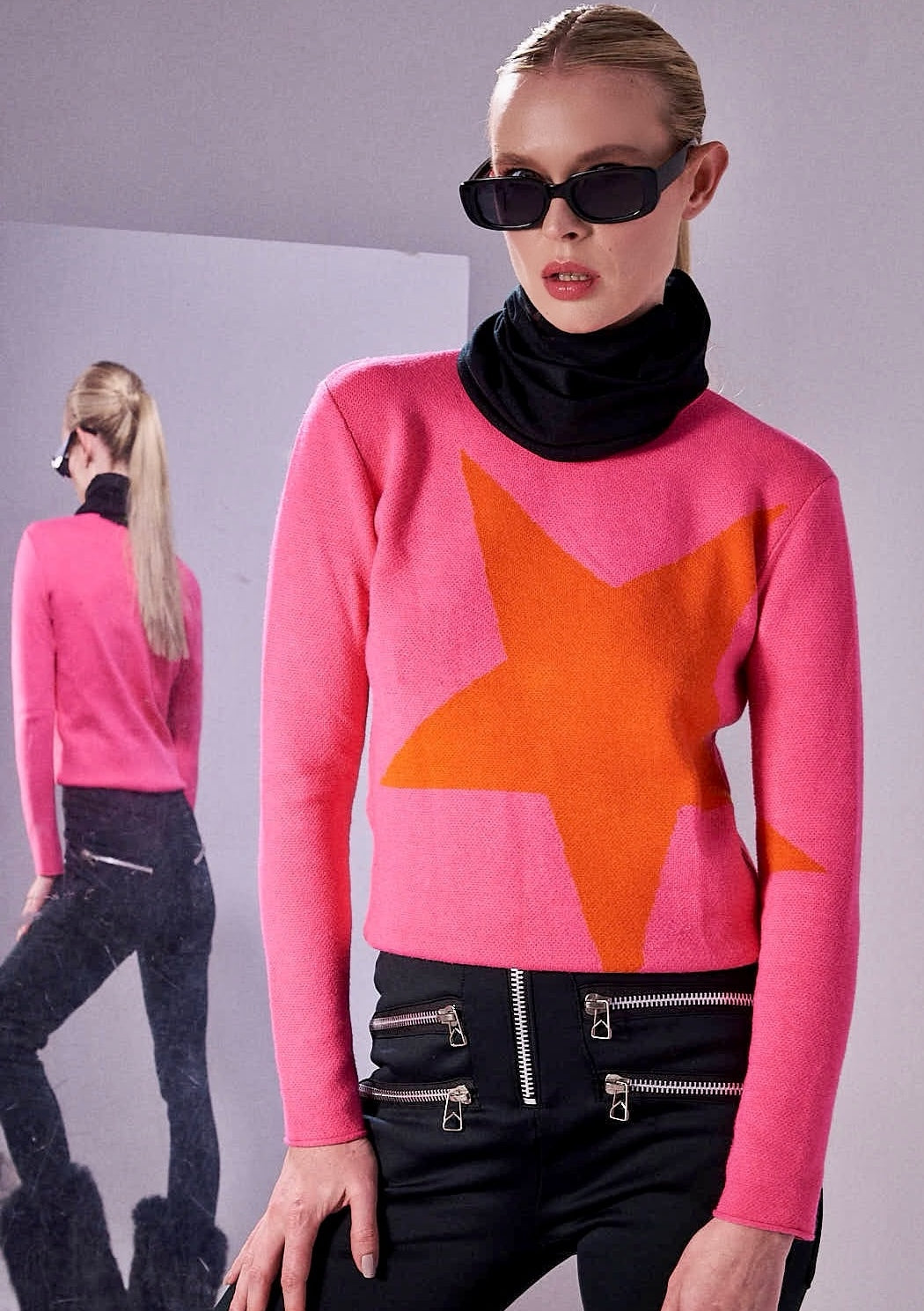 Malha tricot justa, grossa, com elastano e estrela em jacquard
